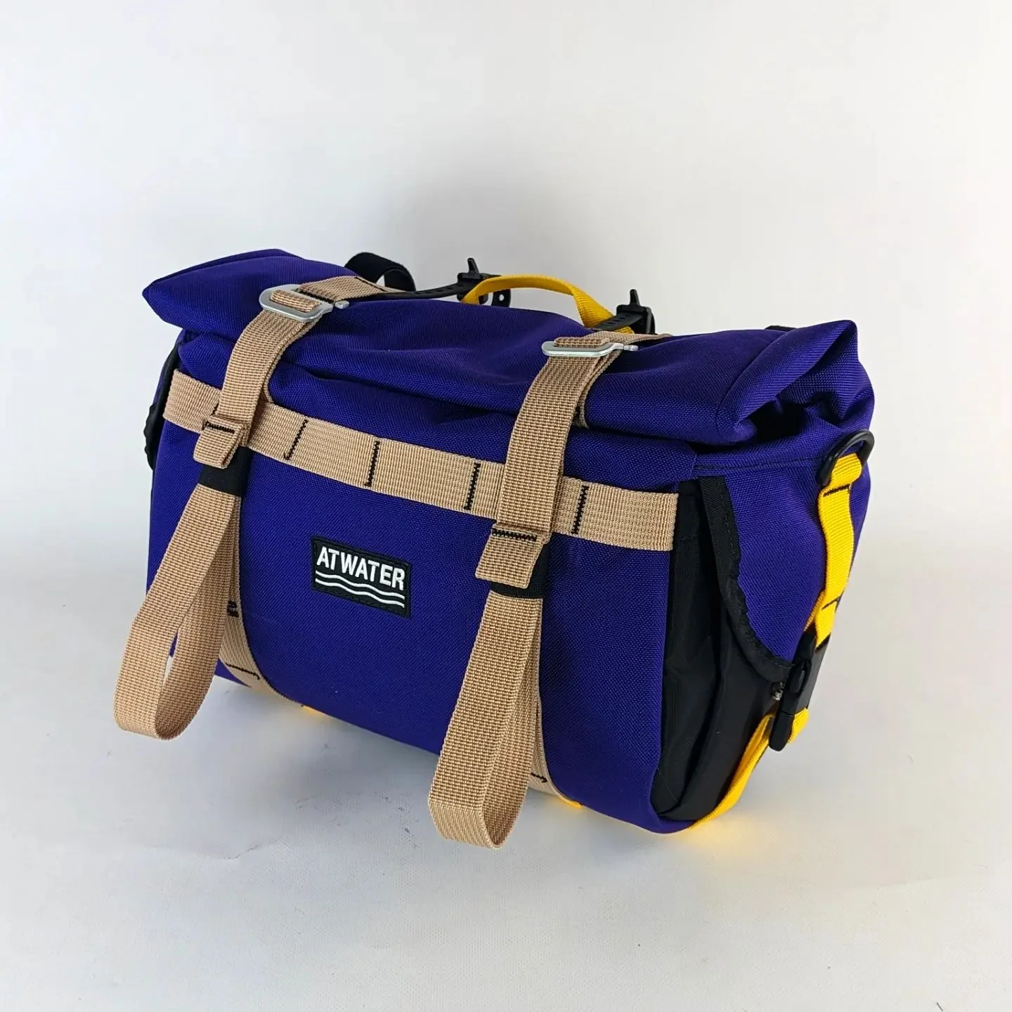 The Atwater Marauder is the ultimate bag! The technical design allows the user to have full control when fitting the bag on to their bike. It can be mounted at the front of the handlebar or at the rear via the saddlebag loops. The bag is constructed with over 20 modular attachment points, allowing for a universal fit and the ability to attach more pouches for personalized use. The roll top access with the buckle closure system is a simple method of keeping things secure and being able to compress or attach cargo efficiently. The internal base includes an HDPE plastic insert to prevent sagging and to help keep the shape of the bag. The expandable side pockets are constructed with double-layer nylon fabric plus an elastic closure, expanding up to 4in in size.